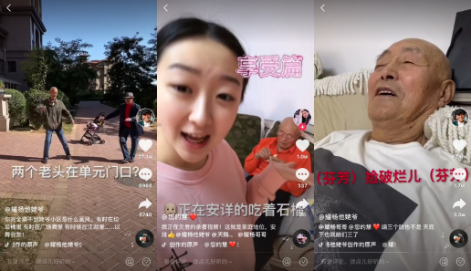 儿孙们和姥爷在一起,也是特别快乐的,“姥爷每次出门,都会用东北特有的方式打招呼。比如有一期视频里,我姥爷和一位坐轮椅的大爷打招呼,‘哎呀,又在这晒紫外线呐!’其实这都不是调侃,而是他特有的打招呼方式,姥爷就这样在小区里屡战屡败,屡败屡战,终于在小区里有了朋友,其实特别正能量。”