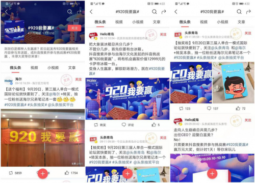 本次挑战赛作为海尔即将在9月20日召开的第三届人单合一模式国际论坛的预热活动,除了邀请粉丝们分享自己的生活外,海尔文化更发布了一系列带有#920我要赢#标签的官方短视频作品。从为厂宠大白鹅提供碧水蓝天严密安保,到“不务正业”打造包括生态农业、疗养院等业态在内的金融全产业链,再到揭秘能让人不逢佳节都能胖十斤的海尔食堂,不仅成为激发受众说出自己故事、参与活动的源动力,也为920论坛打下了良好的传播基础。