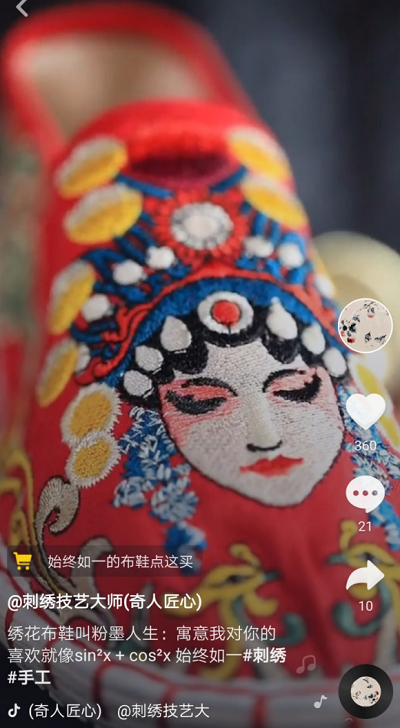 年轻女性喜欢穿高跟鞋,刺绣手艺人抓住这一点,将刺绣绣制在高跟鞋上,为高跟鞋增加美感,为高跟鞋带来新的视觉体验。一双鞋子,受到超过6万抖音网友点赞。