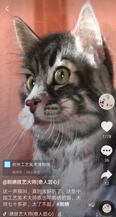抖音已经成为国内最大的非遗传播平台。截至2019年4月,1372个国家级非遗项目中,抖音上涵盖1214项,涵盖率达88.4%。国家级非遗项目相关视频数量超过2400万,播放超过1065亿次,获得点赞超过31亿次。抖音已经成为国内最大的非遗传播平台。截至2019年4月,1372个国家级非遗项目中,抖音上涵盖1214项,涵盖率达88.4%。国家级非遗项目相关视频数量超过2400万,播放超过1065亿次,获得点赞超过31亿次。抖音上还有很多像陈水琴一样的人,在默默坚守刺绣技艺,想尽办法将刺绣呈现在人们眼前。
