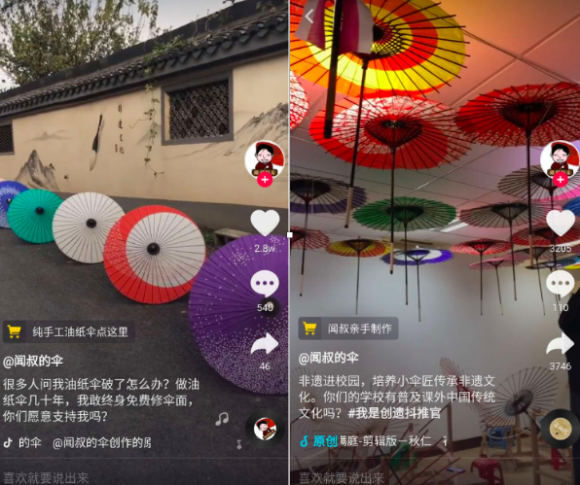抖音平台是闻士善的新尝试,他希望利用在年轻人中流行的短视频平台,推广传统制伞工艺。作为国内最大的记录非遗的短视频平台,1372个国家级非遗项目相关视频,在抖音上播放超过950亿次,获得点赞超过16亿次。越来越多的年轻人通过抖音了解中华文化。