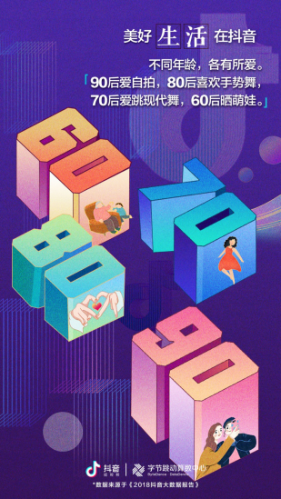 1月28日,抖音发布《2018抖音大数据报告》(以下简称“报告”)从短视频的数据,描绘出了包括80、90后在内的不同年龄群体的代际差异。报告显示,每个年龄段的人都在用抖音记录生活中的美好瞬间。其中,90后抖音用户喜欢用自拍表达个性,80后喜欢拍摄手势舞,70后最爱拍单人现代舞,60后用抖音记录记录萌娃、关注孙儿辈的成长。