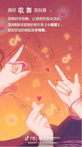 除此之外,报告还从产品发展、城市形象、传统文化、人文表达等多个方面阐述抖音社会价值。报告显示,抖音用户全年打卡2.6亿次,北京是2018年度“抖音之城”,凤凰县是最受欢迎的县城;水墨画是传统文化中播放量最高的类别,《小星星》和手势舞,分别是年度最受欢迎的音乐和舞蹈。
