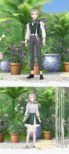 少女一袭优雅丝绸衬衫搭配墨绿短裙,少年格调长裤搭配古典马甲,他们即将在森林学院度过一天~