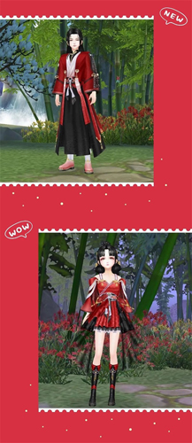 公子一袭红衣飘飘,立于竹林下惊艳绝伦,少女身着丹红长裙,如晚霞般明艳照人~
