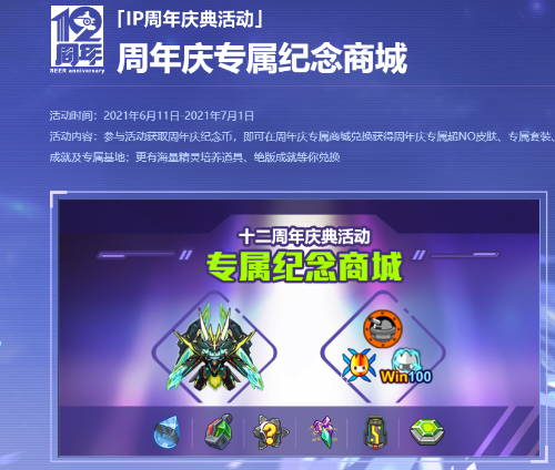 活动内容:参与活动获取周年庆纪念币,即可在周年庆专属商城兑换周年庆专属超NO皮肤、专属套装、专属成就及专属基地;更有海量精灵培养道具、绝版成就等你兑换。