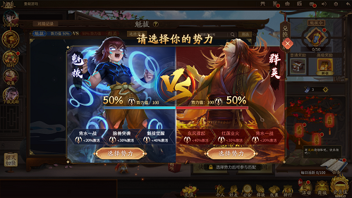 在本次联动版本中,到达20级的玩家可以选择加入“魁拔”与“群英”两大阵营。扮演三国群英,三人组队分别与反对魁拔的神圣联盟军以及支持魁拔的魁拔十二妖进行对抗拉锯战。