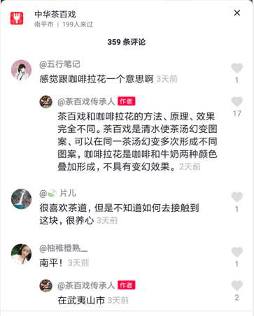 不少网友对这门艺术产生了好奇,不止一位网友在评论区问,这是不是类似咖啡厅常见的咖啡拉花?传承人急忙“正名”道:茶百戏和咖啡拉花的方法、原理、效果完全不同,因为茶百戏是清水使茶汤幻变图案,可以在同一茶汤幻变多次,形成不同图案,而咖啡拉花是咖啡和牛奶两种颜色叠加形成,不具有变幻效果。