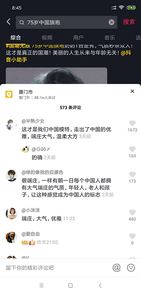 这样的感慨延续到了抖音这则视频的评论里。不少网友赞叹黄炎贞端庄、大气、优雅、温柔,有一种闲庭漫步的感觉,“走得比旁边的模特还好”、“她就是主场”,75岁的年龄更人感到,美丽的人生从来与年龄无关。