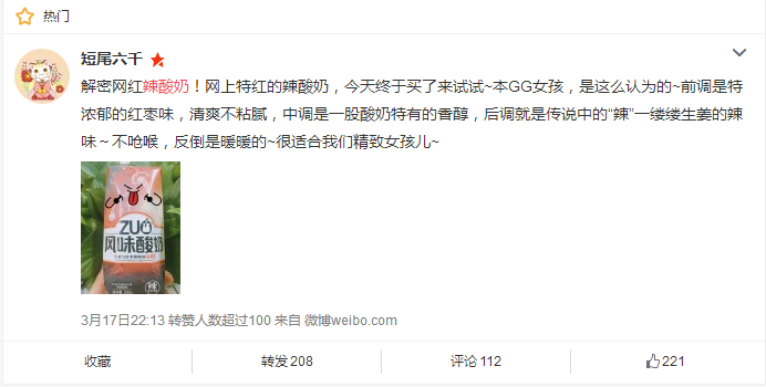 "颠覆味觉三观"的口味,新奇的苦辣咸酸奶甚至成为抖音网红的标配,各种抖音玩家竞相要尝试这款网红酸奶,与之同框博人关注,开启花式ZUO酸奶模式。有些虽然只是赶潮流跟风尝试,过后却意外发现苦辣咸三款竟是意想不到的好喝,连微博的美食博主都自发测评,尝试这款网红酸奶的独特口味,科普达人利用科学方式考究这款网红酸奶的过人之处,让网友们更加对这位新晋网红感到好奇!