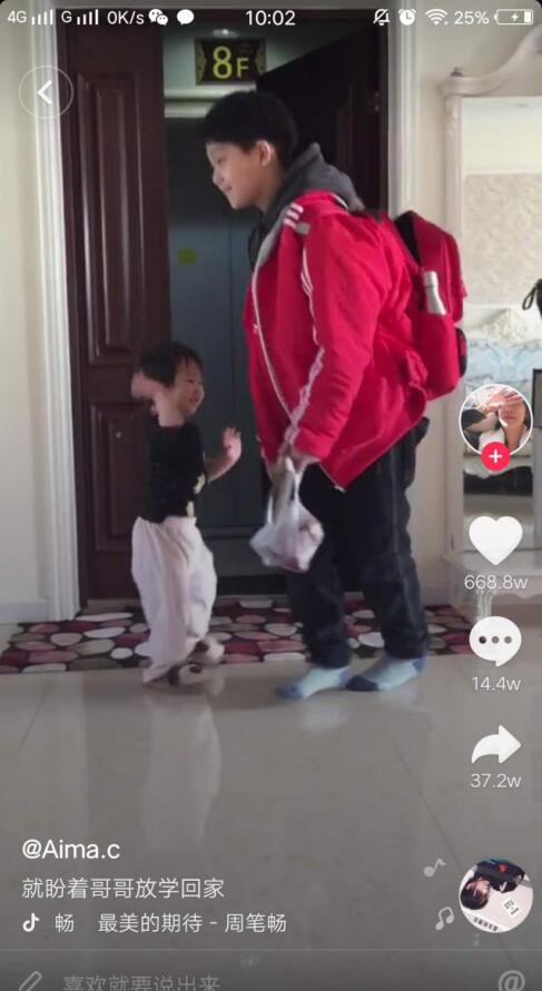 视频中的小姑娘欢快的在屋子里蹦来蹦去,不断催促哥哥抱抱自己。而哥哥面对妹妹也十分温柔,迅速放下手里提着的东西,就把妹妹抱了起来,妹妹这才心满意足。