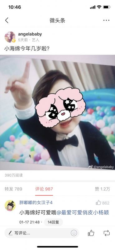 17日是小海绵的一周岁生日,baby也是首次晒出儿子正面照为其庆祝。小海绵穿着西装搭配领结,还梳着花轮的同款发型。一只小手高高举起比出“1”,开心大笑时牙齿若隐若现,虽然面部被一个可爱的小马赛克挡住了,但肉嘟嘟的脸蛋和粉嫩的小嘴仍看出非常的可爱呆萌,有爸爸和妈妈的高颜值,小海绵肯定相当的帅气。此微博曝光后,众网友纷纷围观留言:“祝小宝贝周岁快乐!”“社会我绵哥生日快乐!”“打着马赛克,都感觉很可爱的样子啊!”。