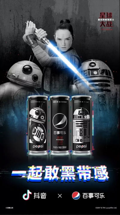 在《星球大战:最后的绝地武士》中国首映将临之际,这款“百事可乐无糖星球大战系列限量罐”与抖音短视频联合发起的#一起敢黑带感#挑战赛活动及系列线上传播动作,可谓亮眼至极。