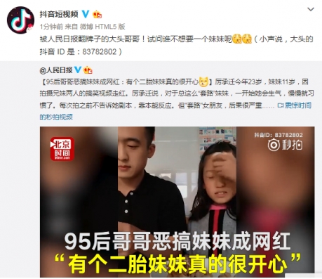山东日照的厉承迁今年23岁,他有个二胎的妹妹,今年11岁。对他来说,“宠妹”这种事情,压根不存在的。他最喜欢的是在家捉弄和“恶搞”自己的妹妹,并拍成搞笑视频发在抖音上,还因此成了网红。目前他的抖音账号:大头大头下雨不愁,已经有了196万的粉丝,每个视频的点赞量都破万,视频的总点赞数更是高到1100多万。