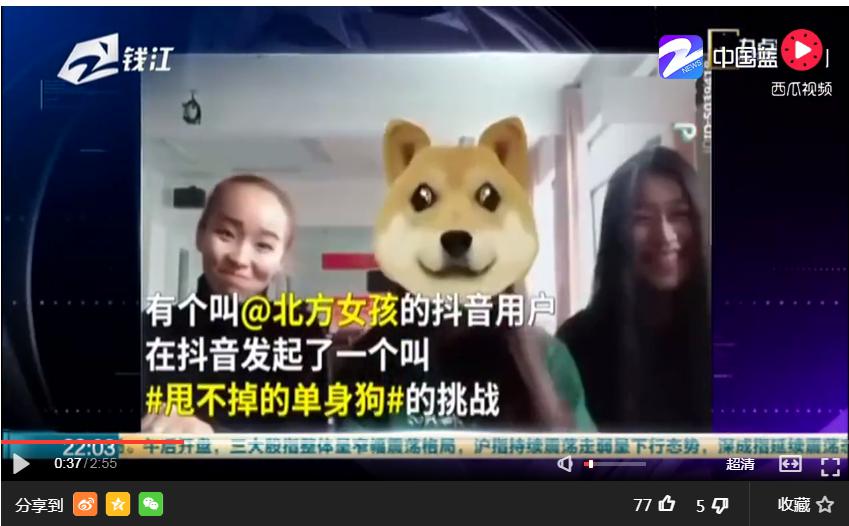 据浙江电视台介绍,这个潮流的源起是抖音用户“北方女孩”发起了一个“甩不掉的单身狗”的站内挑战,用的是一个抖音新上的狗头贴纸功能。几个好友之间,相互甩头,根据抖音人脸识别的功能,狗头贴纸就会自动套一个人的脸上。