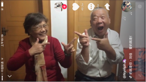 Nymph有空的时候会把粉丝的祝福和留言一条条念给爷爷奶奶听,对于自己的“抖音首秀”受到那么多关注和喜爱,两位老人感到非常惊讶和受宠若惊。现在,念过七旬的他们已经彻底爱上了抖音这款原本定位年轻用户社区的产品,这两天还跟Nymph一起学“可爱颂”等其他抖音上的热门舞蹈,可以说是最潮的爷爷奶奶了!