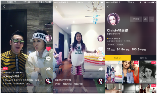 在抖音上玩的最开心的还是要属性感女神钟丽缇。她对彻底抖音上瘾了,没事就拍着玩,不仅自己玩,还带着老公,女儿一起玩。目前,钟丽缇在抖音上已经发了三十多条短视频,积累了近百万粉丝,俨然一副抖音网红的架势。
