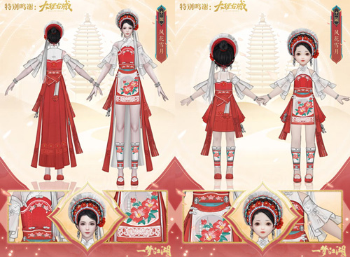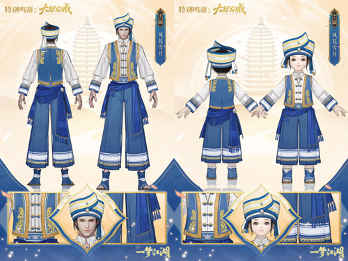 白族服饰以白色为美,添加明快艳丽的色彩,使其简约却不单调。白族以大理盛景“风、花、雪、月”为基础视觉符号,绣出独特绚丽的服饰,向世人诉说着白族文化的古往今来,一梦江湖也以“风花雪月”为名,推出了本次的联动时装。