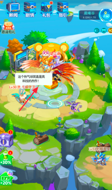 首先玩家要先去晨曦谷,在如图图1位置处打败猫头鹰,点热气球,然后乘坐热气球去飞陆岛就能见到飞行系院长了,具体如图2所示。