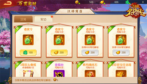 1、「万贯家财」分为汉将商店和军功商店;